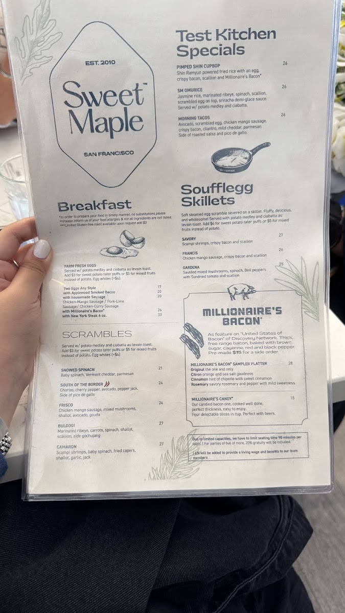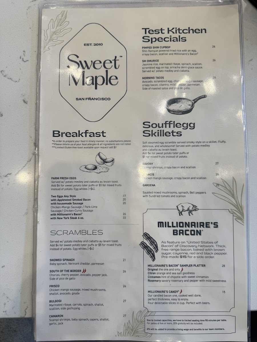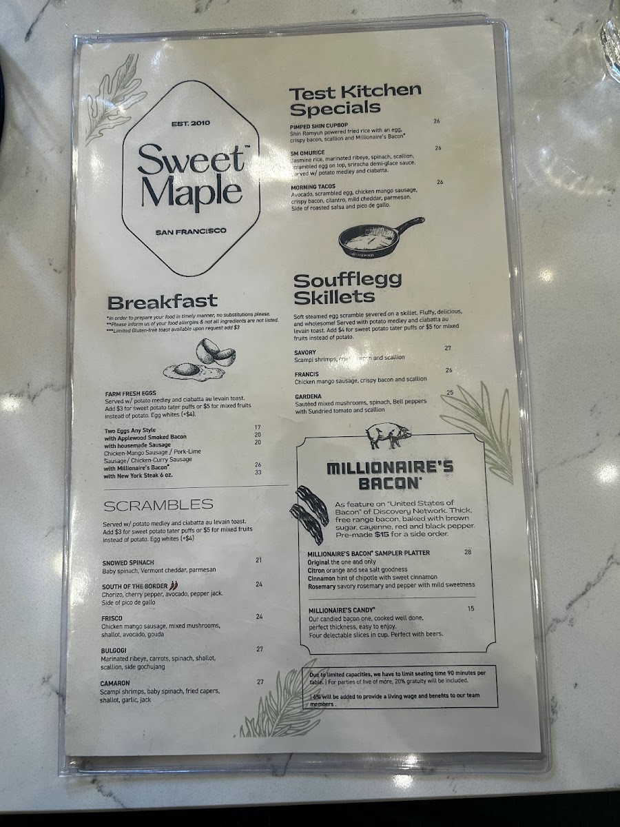 Welcome to Sweet Maple, a gem nestled in San Francisco's vibrant brunch scene at 2101 Sutter St. Specializing in delightful morning meals, their menu is a tribute to classic brunch fare infused with a twist.